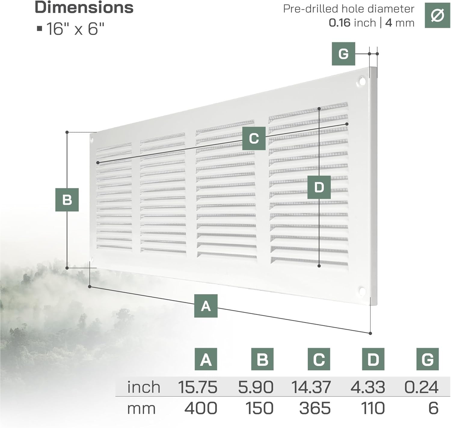 - Overall size: 16" x 6"